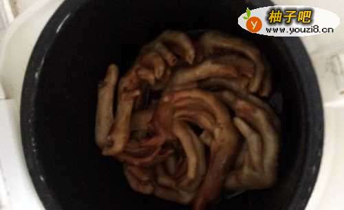 2清洗好的鸭爪放入电饭锅,浇上酱油,揉搓均匀;