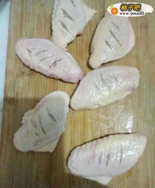 2将洗好的鸡翅背面与正面用刀划几刀,这个做法是为了之后在煎的过程中允许更好的入味。