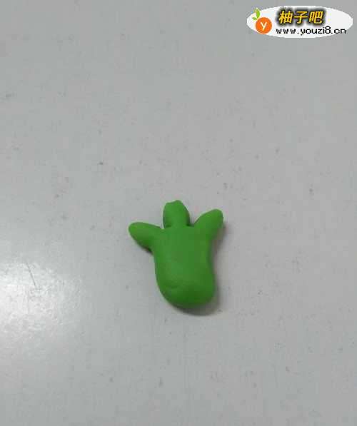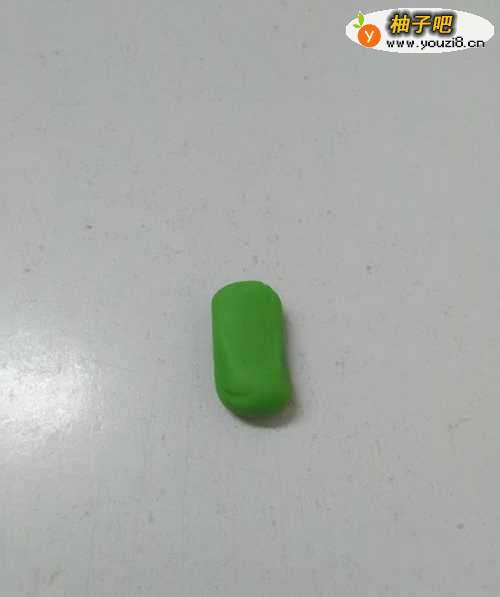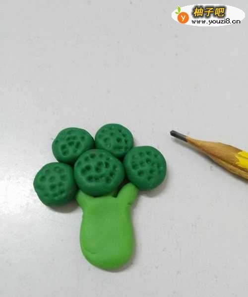先用一块浅绿色彩泥搓成圆圆的、短短的圆条,当作西兰花的花茎。