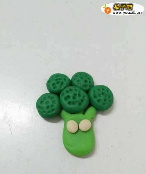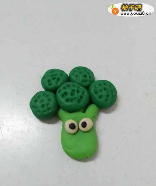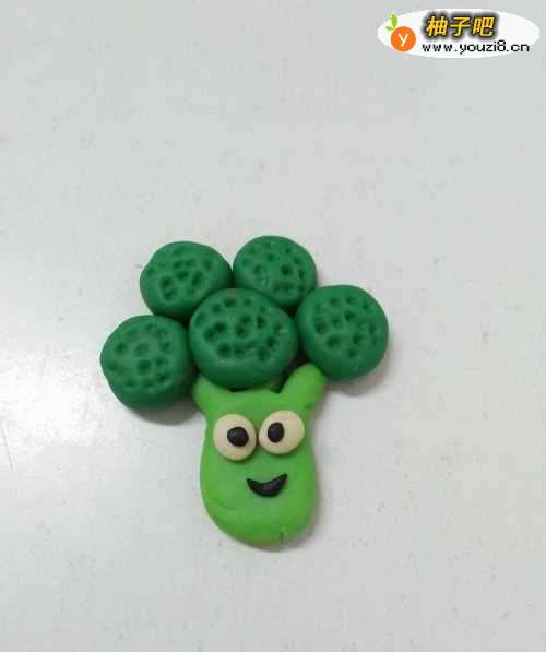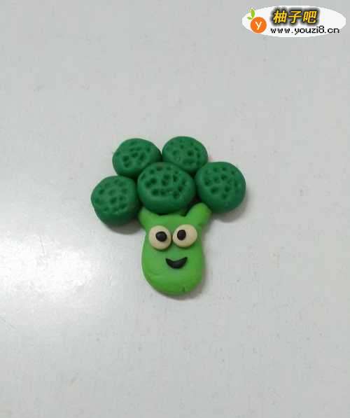 8用一块黑色搓成细细的小条,弯成圆弧形状,粘在眼睛下面,当作它的嘴,可爱的西兰花就做完了。