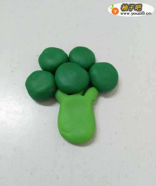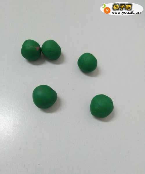 3用深绿色彩泥搓五个差不多大小的圆球,用来做五团花朵。
