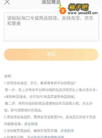 5.点击添加商品,输入淘口令或商品链接。