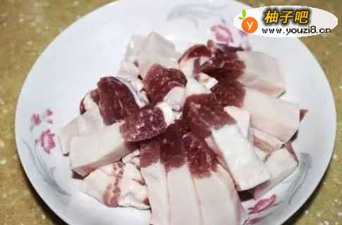 1、五花肉一块(用量根据自家食量来定),五花肉猪皮烫一下毛,洗净切大小为3cm左右的块。