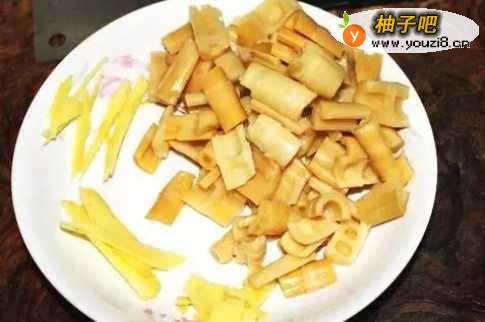 66、春笋洗干净,切成3cm左右的块,装盘备用。