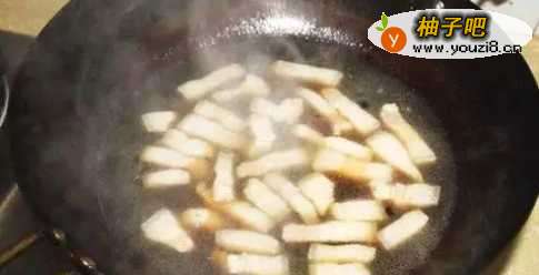 22、改刀切成小块(不要太小,厚度适中即可),锅中放水,加热至沸腾,在热水里焯水沥干备用。