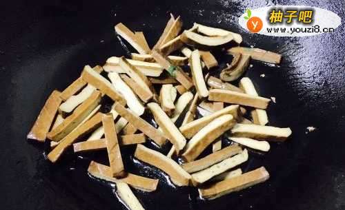 3然后开火,锅烧热之后加入少许油,油温至8成热的时候加入切好的豆干煸炒,煸炒30秒即可。