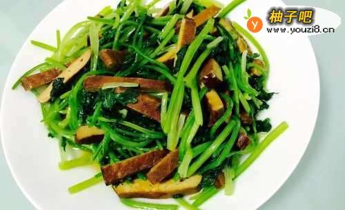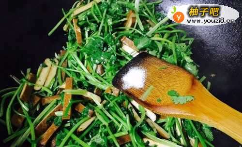 5翻炒30秒之后再加入少量盐进行调味即可熄火了。因为豆干本身就有咸味,所以盐切记不可放多了。香菜本身也能生吃,所以烹制时间不可过长。
