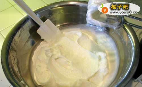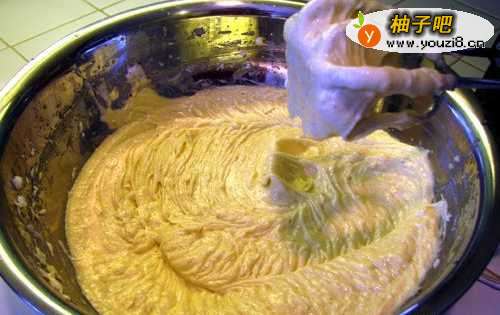 混合起酥油,油和糖,在一个非常大的混合碗里,设置一个手动搅拌器来搅拌蔬菜与油的起酥油。加入糖并混合至光滑。
