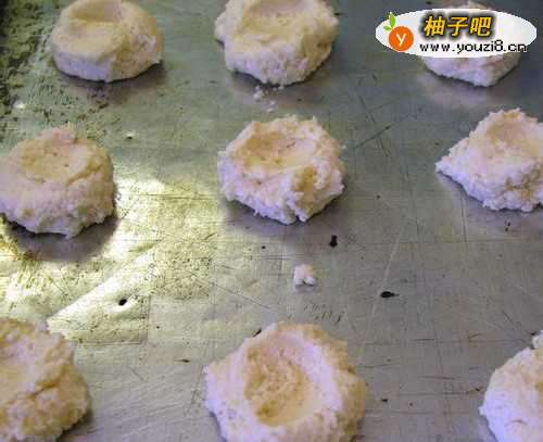 4形成形状,放在饼干和烘烤,烤箱预热325F(162C)度。用一茶匙舀出一团面团。设置你的手形成关于核桃大小的球。如果面团太粘,不可以滚成球,再加入面粉(从1/4到1/2杯)。将球放在未粘合的饼干片上。轻轻按下每个球的中心稍微变平。设置打蛋白,刷在每个饼干的顶部。烘烤饼干,直到它们的底部边缘开始变成浅棕色 - 约15-20分钟。