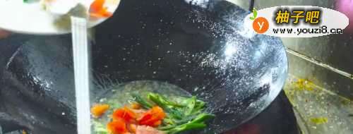 9接下来就是炒制我们的辅料,油温7成热,倒入青椒,西红柿,生姜和蒜瓣,炒