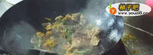 10辅料炒好后倒入我们前面爆熟好的肉片,加入2g盐,3g鸡精和5g生抽。