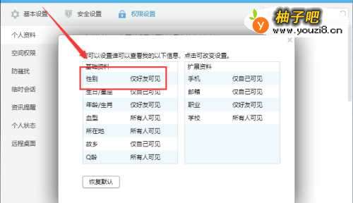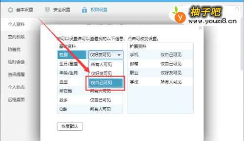 4在弹出的对话框中,我们就可以够使用自己的个人资料可对谁可见,如所有人、仅好友或仅自己可见,其中“仅自己可见”就是对其他所有人隐藏,找到“性别”栏。