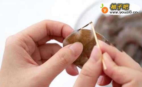 2准备一根牙签,从虾壳第二节与第三节中间穿入,拉除虾肠