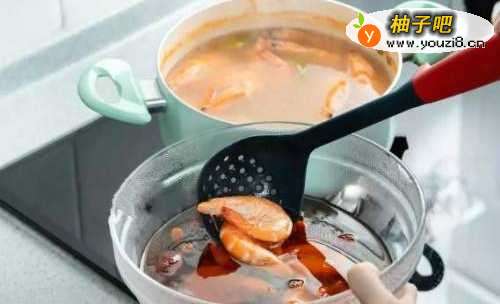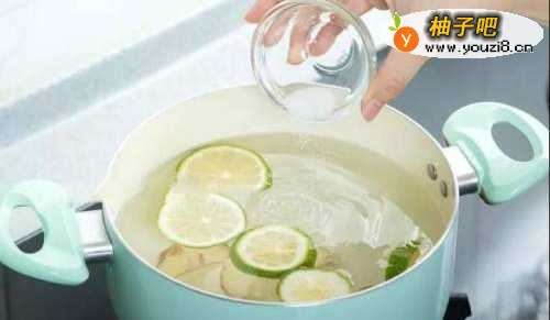 5另外准备一锅水烫虾,放入姜片、柠檬片、盐,可帮助虾去腥