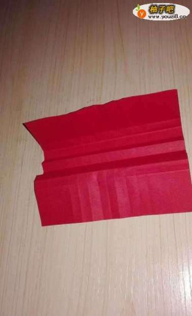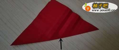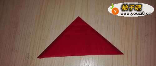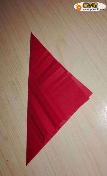 6对折好后,角对角对折成一个小三角形,小三角形顶角处有一个小四边形,然后对折。(小四边形已经标出来了。)
