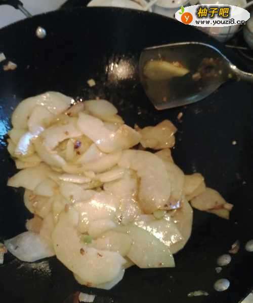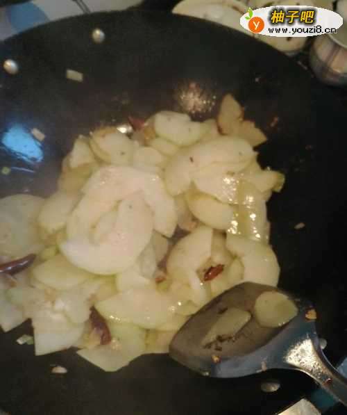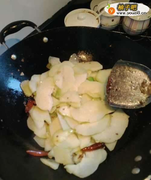 4第四步,倒入切片的佛手瓜,在锅中翻炒。