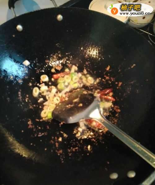 3第三步,等红辣椒被煎的差不多以后倒入葱和姜,翻炒一会。