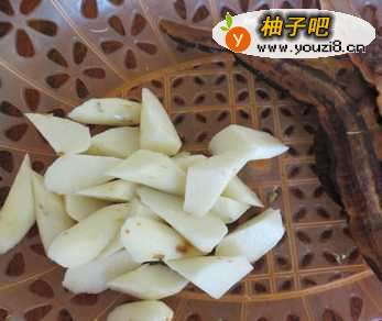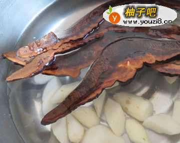 3锅中加入1500ml水,放入灵芝片开始煮(用砂锅或者不锈钢锅),在水中滴入几滴醋,把山药洗净削皮,顺便把手浸泡一下(手在稀释的醋中浸泡一下,切山药时就不会手痒了)。