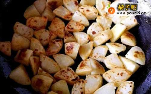 4煎几分钟后我们就看到土豆就会变色了,我们要把土豆两面都煎成带有黄色的,最好不要煎了,