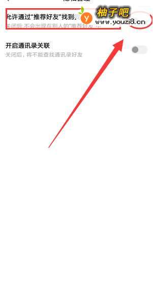 6来到隐私管理的页面,找到有个能够通过“推荐好友”找到我,将后面的按钮开启,就能开启此项功能了,如图所示