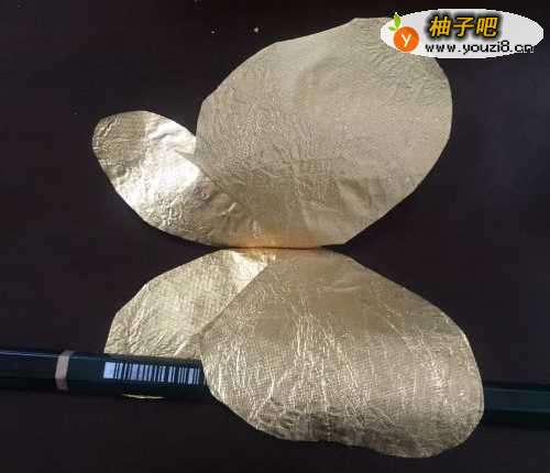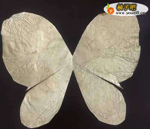 用铅笔贴着蝴蝶的翅膀,轻轻卷出一点点弧度。为追求更逼真的话,能剪两条细细的糖纸,粘在蝴蝶的头部,做成蝴蝶的触须。这样一只美丽的小蝴蝶就完成了。