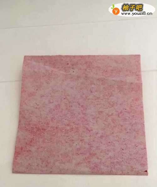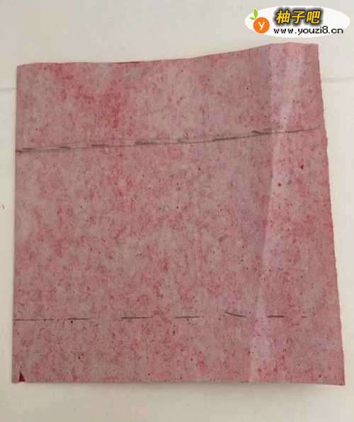 第一步 把一张16厘米X7厘米的长方形红色彩纸 竖起来 从下向上对折整齐
