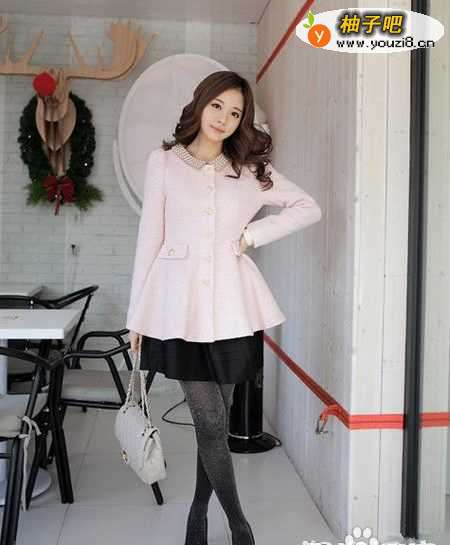 2淡粉色的毛呢 面料的大衣 ,腰身处采用了完美的收腰设计,让腰身的线条更为的纤细,褶皱质感的衣摆,精美的裙式线条,显露出浪漫的色彩,精致的小翻领,珍珠 的点缀,更为的高贵。