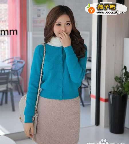 湖蓝色的精致针织衫 ,鲜艳甜美的色彩,散发出迷人的甜美气息,细腻而轻柔的面料,亲肤的感觉,穿着起来非常的舒适,衣领采用了纯白色的皮草 面料,更为的温馨浪漫。