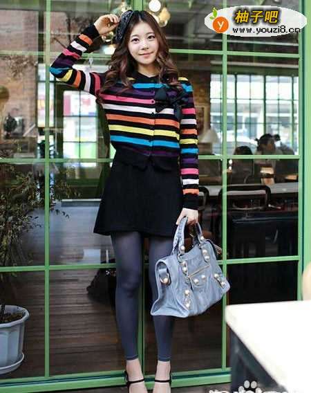 5鲜艳的彩条色彩的针织衫,鲜艳的条纹,让衣衣具有立体的层次感,细腻而轻柔的面料,亲肤的感觉,穿着起来非常的舒适,精致的小圆领,松紧的衣摆,具有完美的塑形效果。