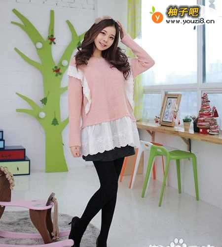 7淡粉色的针织衫,衣摆下方采用了轻柔的雪纺面料拼接设计,飘逸的线条,显露出迷人的浪漫质感,随意而松垮的版型,没有拘束感,更为的温馨浪漫。