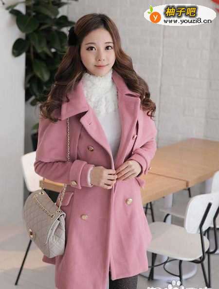 4淡粉色的毛呢大衣 ,肩部采用了小披风的设计,让肩部的线条更为的立体,金 属色彩的双排扣搭配,充满了迷人的华丽质感,精致而有型的小翻领,呈现出干练的俏皮味道。
