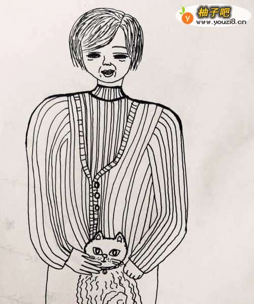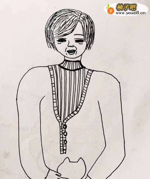 2用笔画出老奶奶的外套,用笔画出外套的线条装饰和扣子。在老奶奶双手位置,画出猫咪的头部。