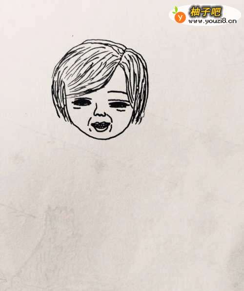 第一步在白纸上,用笔画出人物胆屈头部。用笔画出老奶奶泉侨侨的发型和五官。老奶奶脖颈线条下沿画出高领衫。