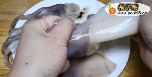 22.准备好鱿鱼,我用的是在超市买的无头冰冻鱿鱼,买回后放在冷水中,让它自然解冻,解冻后,将鱿鱼的外皮用手撕下来,然后将鱿鱼里边的鱼骨去除干净,把洗净,擦净水分。