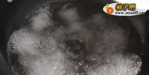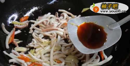 44.锅加水烧开,淋入料酒和两片姜,下入鱿鱼焯水,把鱿鱼炒至卷起来,捞出,放在冷水中投凉,捞出控净水分待用。料酒和姜能去除鱿鱼的腥味。