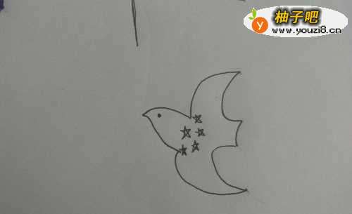 6在和平鸽的身子上也画上五颗星星,最后我们画上几个气球,能在气球上写上祝福的话。