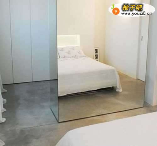 这是一个由四面镜子组成的大型镜盒,放置在卧室中央隔开床和衣帽间,站在不同方向都能看到穿衣的效果,镜盒里面还能收纳装饰品。镜子隔断还有放大空间的作用。