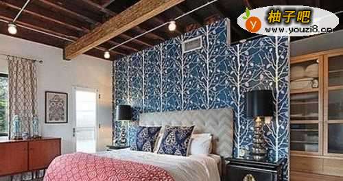 在卧室内设一立板,上面绘制一些装饰图案,安装在床头的位置,木板制成的床头背景墙将室分别划分为卧室和小书房。