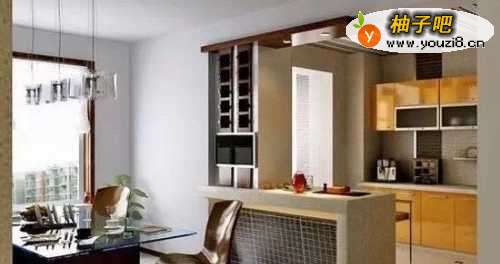 开放式厨房与客厅相连,在厨房外侧做一个造型简单大方的吧台隔断,或者放置一个酒柜,也不失为一种经济实用的设计。吧台或酒柜作为客厅和厨房、厨房和餐厅的隔断,效果十分显著。