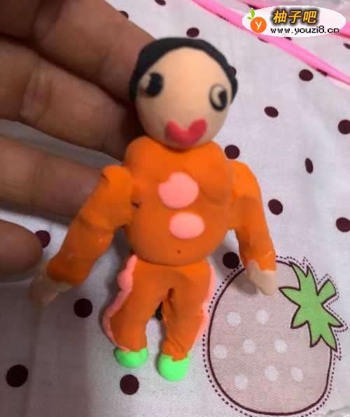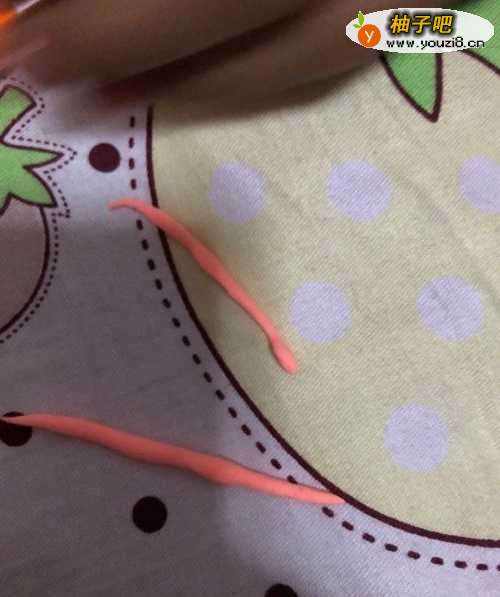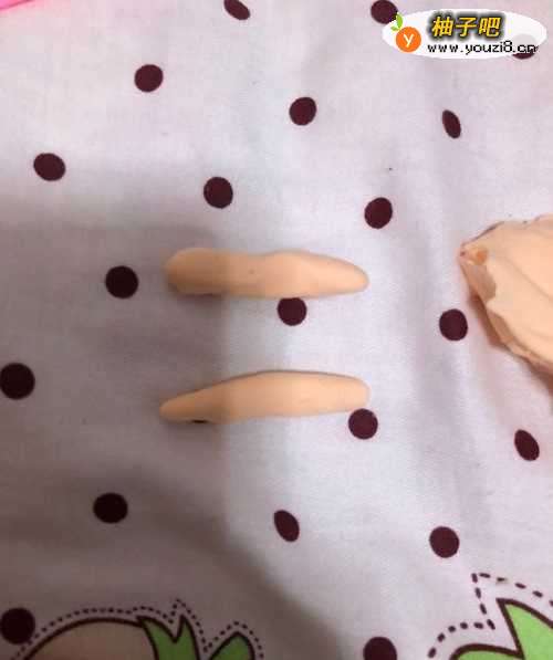 5在拿出粉色的彩泥揉成两个小长条在拿出橙色的彩泥把粉色的彩泥包围上面,把做好的胳膊粘到上面。