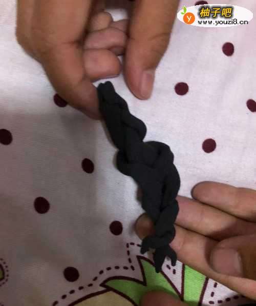 4在拿出绿色的彩泥揉成两个小圆柱粘到脚下面。一连接。在拿出黑色的彩泥揉成三条长条编成小辫。粘到后面,在拿出黑色的彩泥揉成长条按扁,粘到前面当头发帘。