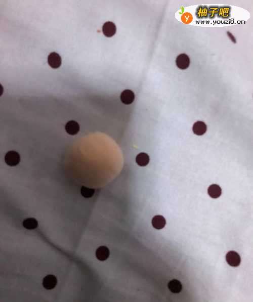 拿出粉色的彩泥揉成一个圆形,在拿出黑色的彩泥揉成两个圆形,在拿出粉色的彩泥揉成两个圆形,粘到圆形上面。
