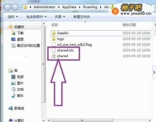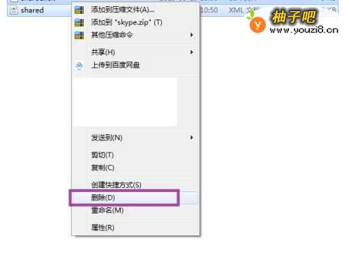 9然后选中“shared.lck和shared.xml”两个文件,然后右击,弹出右击的下拉子菜单,在下拉子菜单中可见“删除”,点击删除,将“shared.lck和shared.xml”两个文件删除,然后重新运行skype。