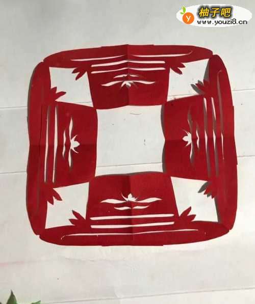 6第六步 剪完外围多余的彩纸之后 再剪里面的细节部位 和镂空部分 还有其它涂实的部分等等 全部剪完之后 展开压平 一副漂亮的礼帽纹样图案就裁剪完成了
