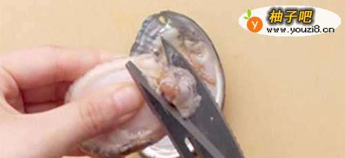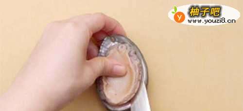 2用刷子将鲍鱼肉和鲍鱼壳刷干净,用小刀小心的将鲍鱼肉贴着壳挖出。