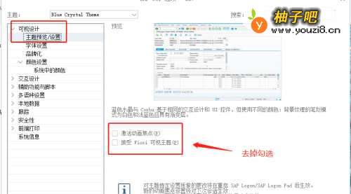 2在“选项”界面,选择【可视设计】→【主题预览/使用】,取消勾选【打开动画焦点】和【授受FIORI可视主题】;