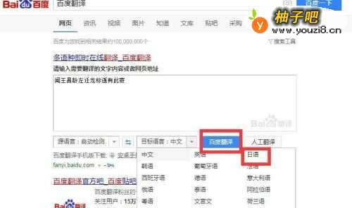 5然后点击“目标语言”,选择“日语”,接着点击“百度翻译”,如图