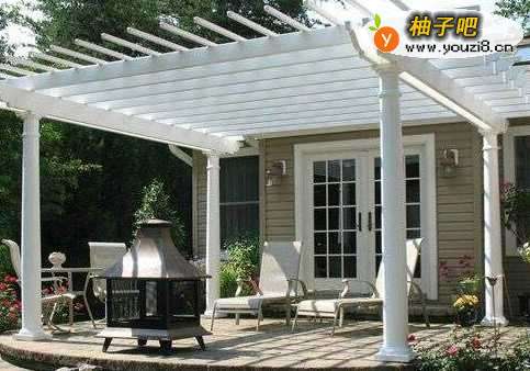 5刚刚上面讲道廊架能是石材、金属、钢筋混凝土为重点原料,如下这种能是白色石柱加梁架,中间横条能是金属架组合,上面如果需要结顶我们能用钢化玻璃,然后下面吊顶,那样也很漂亮。