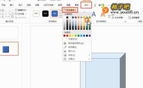 【绘图工具—格式】选项卡→【形状填充】→【浅蓝色】