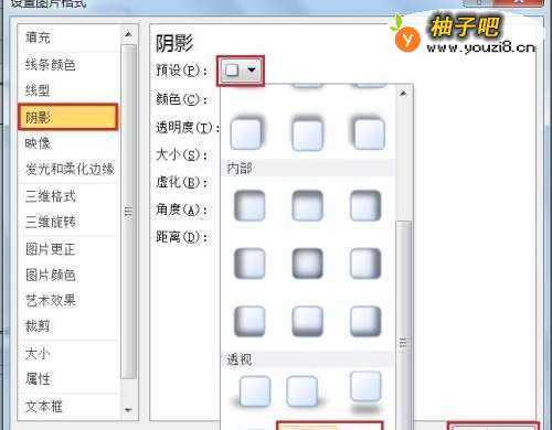 4弹出【使用图片格式】对话框→选择左侧的【阴影】→在右侧【预设】图标处点选下三角形→选择【右下对角透视】如下图所示。